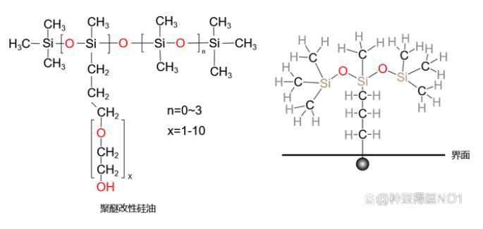 水性體系使用較多的有機(jī)硅潤濕劑一般為聚醚改性硅油,相對(duì)分子質(zhì)量較小,n=0~3,x=1~10。同時(shí)大量的CH3鏈對(duì)外伸展,極大的降低表面張力,研究表明當(dāng)親水基在鏈段中部位置時(shí),效果最好。聚醚改性有機(jī)硅的分子結(jié)構(gòu)式和機(jī)理如上圖所示。