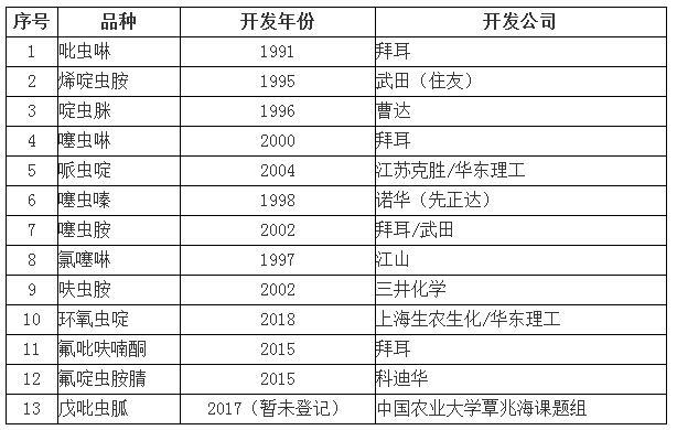 目前,在全球范圍內(nèi)開發(fā)或已使用的新煙堿類農(nóng)藥主要有13種,詳細(xì)信息見表1。
