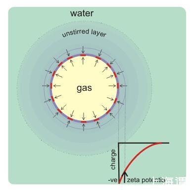 納米氣泡也存在比較強(qiáng)的靜電場,能避免氣泡發(fā)生融合,對抗浮力作用。在水平電場中,氣泡電荷決定于水平速度v=ζε/μ(v=水平速度,ζ=zeta電位(V),ε=水的介電常數(shù)(s2×C2×kg-1×m-3),μ=粘滯度(Pa×s).)