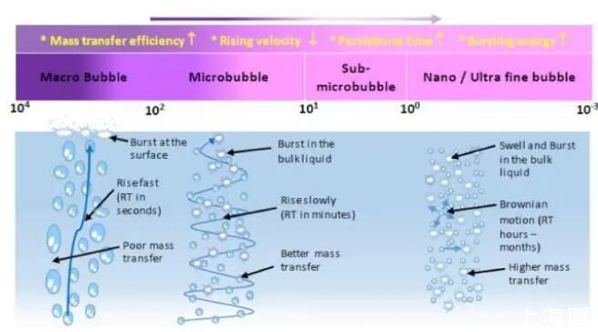 雖然氣泡的研究歷史已經(jīng)超過半個世紀(jì),但是氣泡的類型和分類一直存在爭議。學(xué)術(shù)上對氣泡分類主要根據(jù)氣泡性質(zhì)的不同,最常用的指標(biāo)是氣泡大小、表面特征和氣泡壽命。這些特征主要決定于氣泡大小,因此許多學(xué)者把氣泡大小作為唯一分類標(biāo)準(zhǔn)。按照這個標(biāo)準(zhǔn),氣泡被分為大氣泡、微米氣泡、亞微米氣泡或納米氣泡,也有采用更通俗分類為大氣泡、小氣泡和超小氣泡。雖然學(xué)者們對氣泡的大小范圍具體有不同看法,但大多數(shù)同意微氣泡直徑應(yīng)該在10-100微米的范圍,1-10微米為亞微米氣泡,10-1000納米為納米氣泡。