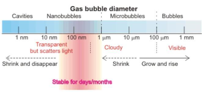 氣泡分類不僅根據(jù)大小,而且根據(jù)其特征和在液體中的行為。圖1對不同氣泡大小的分類進(jìn)行了匯總。1-10微米氣泡其大小和特征都介于微米氣泡和納米氣泡之間,被歸類到亞微米氣泡。雖然學(xué)術(shù)界對微米氣泡的特征有一致看法,但是對氣泡的大小范圍沒有統(tǒng)一標(biāo)準(zhǔn)。