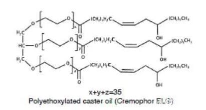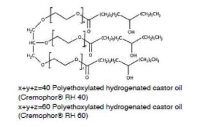 另一類重要的非離子表面活性劑是聚氧乙烯蓖麻油(Cremophor)或聚氧乙烯氫化蓖麻油(Cremophor RH)。蓖麻油是蓖麻油甘油三脂,與環(huán)氧乙烯反應(yīng),親水性的氧化乙烯結(jié)構(gòu)便插入到蓖麻酸和甘油之間,便得到了聚氧乙烯蓖麻油,如果蓖麻油中的雙鍵加氫飽和后,再與環(huán)氧乙烯反應(yīng),那么得到的便是聚氧乙烯氫化蓖麻油。環(huán)氧乙烯和蓖麻油的反應(yīng)位點是隨機(jī)的,因此得到的表面活性劑是一種混合物,也包括未反應(yīng)的蓖麻油和均聚形成的聚氧乙烯。不同種類的聚氧乙烯蓖麻油或聚氧乙烯氫化蓖麻油是通過參與反應(yīng)的氧化乙烯和蓖麻油或氫化蓖麻油的比例決定的,例如Cremophor EL 40或Cremophor RH 40,其中40代表的便是混合物中氧化乙烯和蓖麻油的摩爾比。這類表面活性劑的HLB一般在12以上,常用作難溶性藥物的增溶。