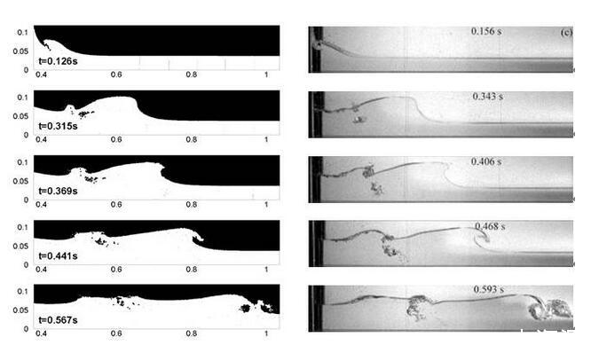 潰壩仿真結(jié)果(左)和實(shí)驗(yàn)結(jié)果[19](右)對比