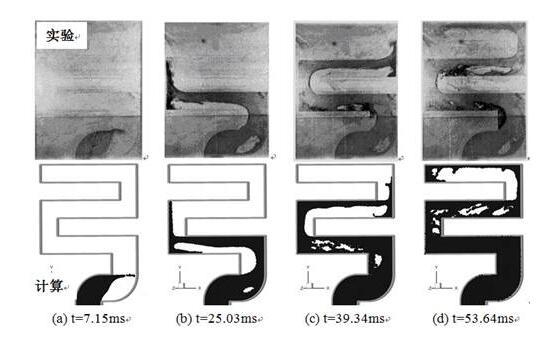 S形型腔充型過程的SPH數(shù)值模擬結(jié)果和實(shí)驗(yàn)結(jié)果[9]對比