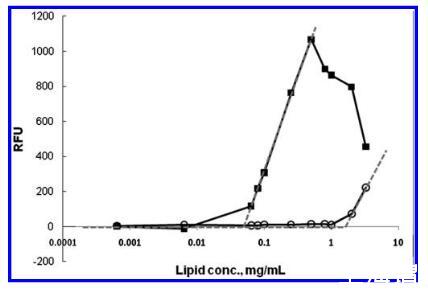 圖2.在不同濃度的脂質diC8PS下記錄的熒光發(fā)射,范圍從64μg/mL到3.47 mg/mL。在對照中,添加純DMSO代替測試化合物(O),1.1 mg/mL的急劇上升標志著diC8PS的CMC。將10μL的10 mM硫利達嗪(9)引入基質(20 mM HEPES緩沖液中的diC8PS),CMC轉移到較低濃度(0.042 mg/mL)。RFU:相對熒光單位。