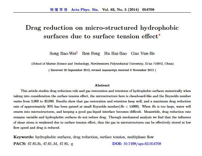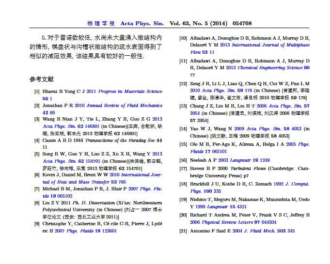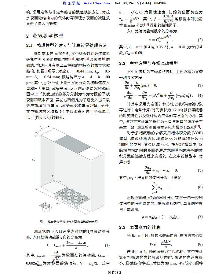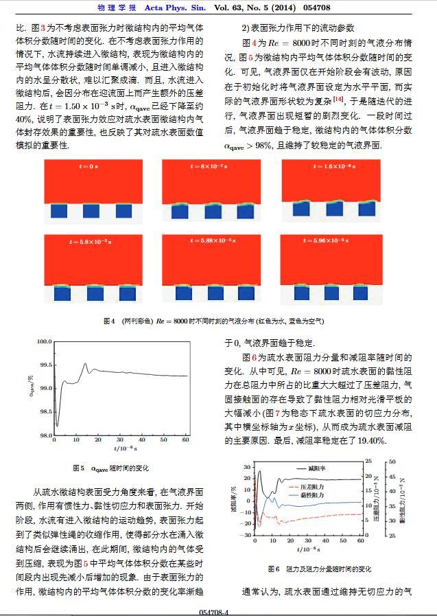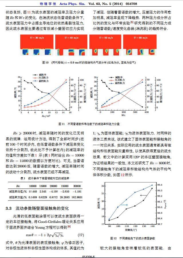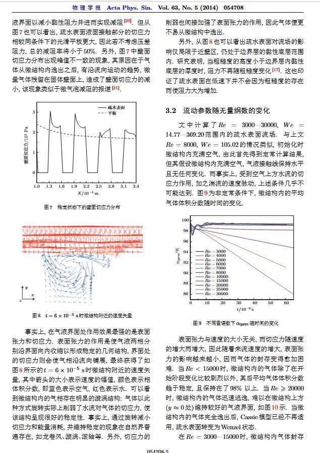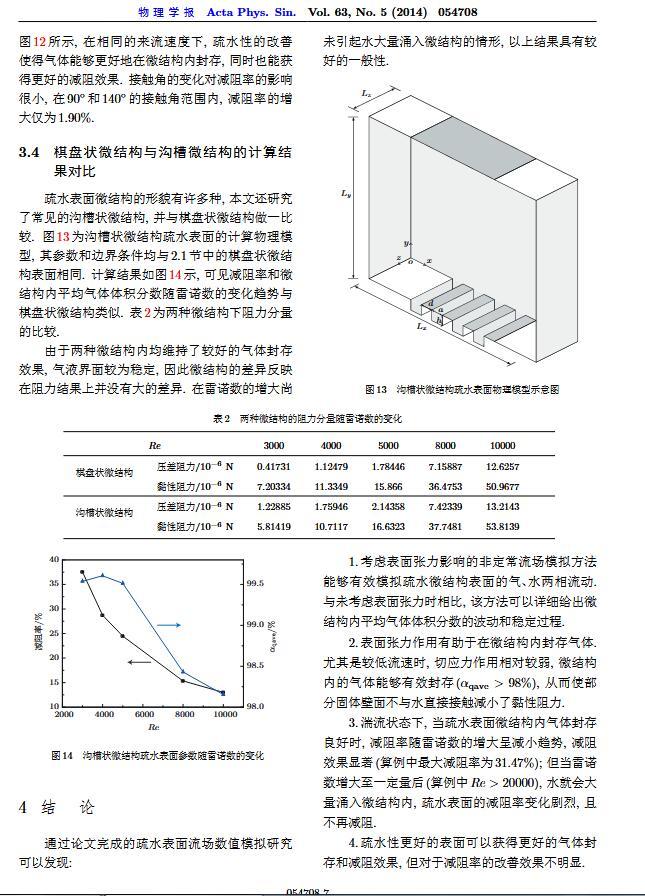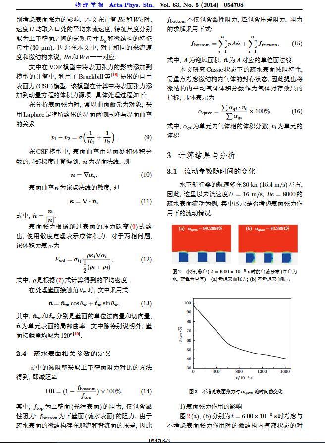 通過構(gòu)造具有棋盤狀微結(jié)構(gòu)的疏水表面,考慮表面張力的影響,利用定常與非定常結(jié)合的數(shù)值模擬方法,研究了疏水表面在湍流狀態(tài)下的減阻特性以及微結(jié)構(gòu)內(nèi)氣體封存的效果,其中Re=3000—30000.在低雷諾數(shù)下,疏水表面微結(jié)構(gòu)內(nèi)氣體封存狀態(tài)良好,減阻率最高約為30%;隨著雷諾數(shù)的增大,壓差阻力增大,減阻率有下降趨勢.當(dāng)來流速度過大時(shí),水會(huì)大量進(jìn)入微結(jié)構(gòu),疏水表面的減阻率變化劇烈,且已經(jīng)不再減阻.結(jié)果表明,表面張力削弱了壁面切應(yīng)力的影響,使得低雷諾數(shù)下微結(jié)構(gòu)內(nèi)氣體能夠有效封存,進(jìn)而減小壁面阻力.