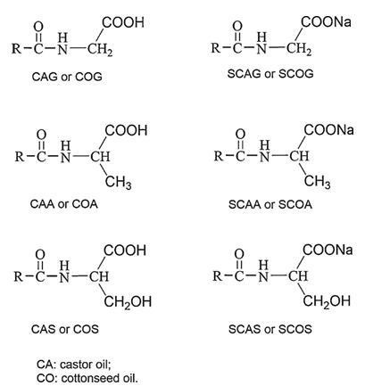 Scheme 2.合成的酰基氨基酸表面活性劑的化學(xué)結(jié)構(gòu)(酸性形式和陰離子形式)。