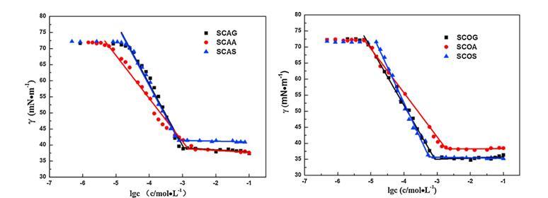 ?;被岜砻婊钚詣?,即相應(yīng)的CAG、COG、CAA、COA、CAS和COS的鈉鹽,通過用NaOH水溶液中和?;被嶂羛H 8-9直至獲得完全澄清的溶液來(lái)制備。這些鈉鹽分別命名為SCAG、SCOG、SCAA、SCOA、SCAS和SCOS。