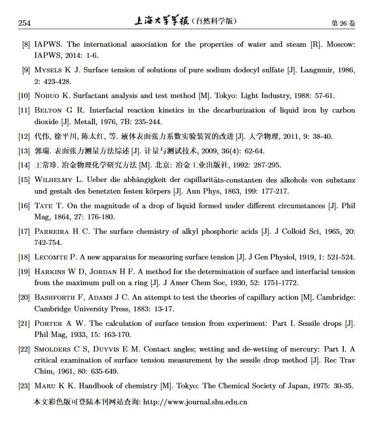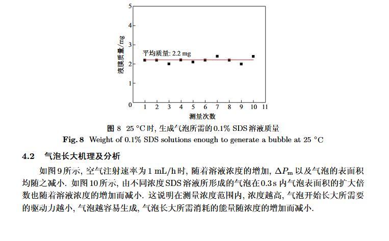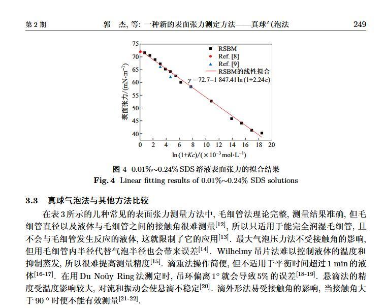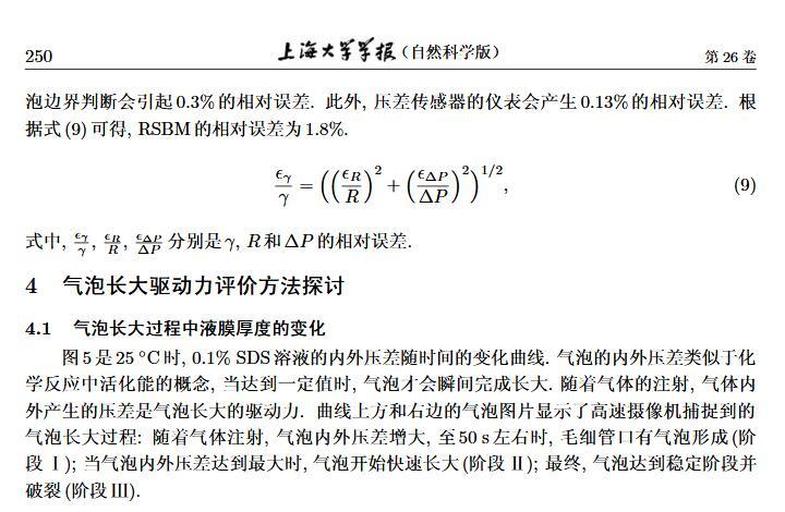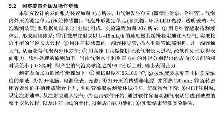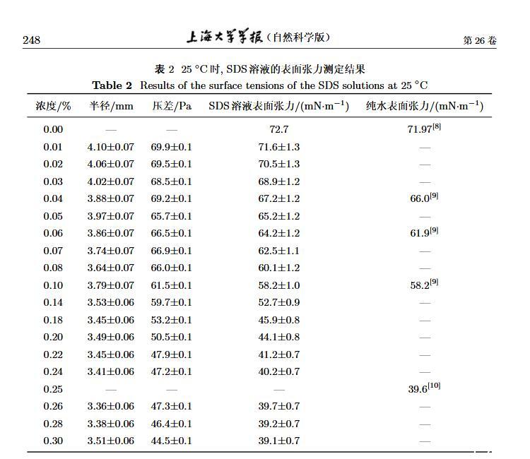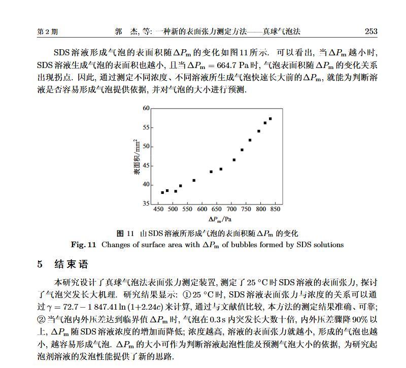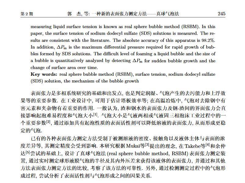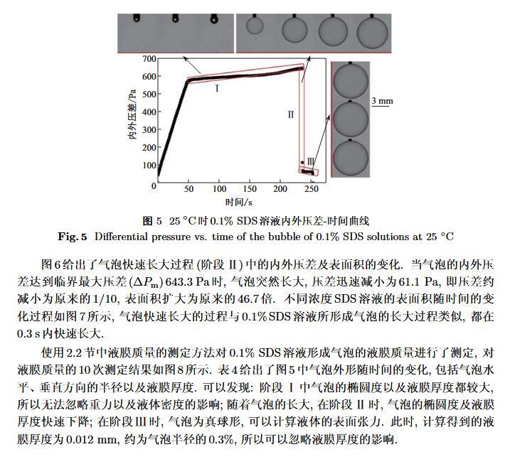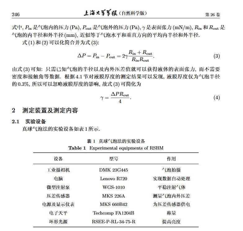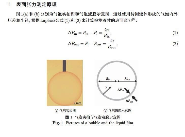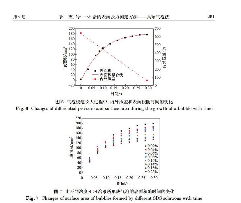 設(shè)計(jì)了一個(gè)新的表面張力測定裝置,通過實(shí)時(shí)測定液膜氣泡的半徑及其內(nèi)外壓差來獲得被測液體的表面張力。該測定液體表面張力的方法簡稱為真球氣泡法(real sphere bubblemethod,RSBM)。對十二烷基硫酸鈉(sodium dodecyl sulfate,SDS)溶液的表面張力進(jìn)行了測定,結(jié)果與文獻(xiàn)值吻合,且測定裝置的絕對精度為98.2。通過檢測到的液膜氣泡突然長大所需要的最大壓差值及其表面積隨時(shí)間的變化過程,定量分析溶液起泡難易程度及氣泡大小的關(guān)系。