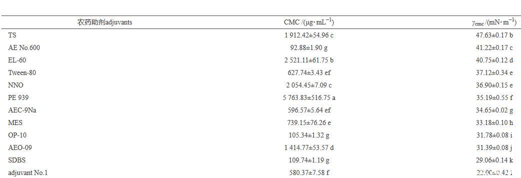 從表2中可見:不同種類的助劑具有不同的臨界膠束濃度(CMC)和臨界膠束濃度時表面張力(γcmc),與其對照(水)相比各助劑臨界膠束濃度時的表面張力均小于水的臨界表面張力[(72.75±0.01)mN/m],并存在顯著性差異。其中,助劑1#、2#和4#當質(zhì)量濃度達到CMC時表面張力的降低率在72.63%~69.75%,助劑4#的效果最好,其次是助劑1#和2#,臨界表面張力分別是(19.91±0.11)、(20.00±0.01)和(22.00±0.42)mN/m。而自制的助劑3#以及目前農(nóng)藥生產(chǎn)上應(yīng)用較為廣泛的常規(guī)綠色助劑十二烷基苯磺酸鈉(SDBS)、烷基酚聚氧乙烯醚(OP-10)、Tween-80和農(nóng)乳600#等與助劑1#、2#和4#相比,對水表面張力的降低能力稍弱,但在P<0.05水平上差異顯著性分析表明均顯著低于水的臨界表面張力。茶皂素對水的表面張力影響最小,臨界表面張力為(47.63±0.17)mN/m,降低率僅為34.53%。