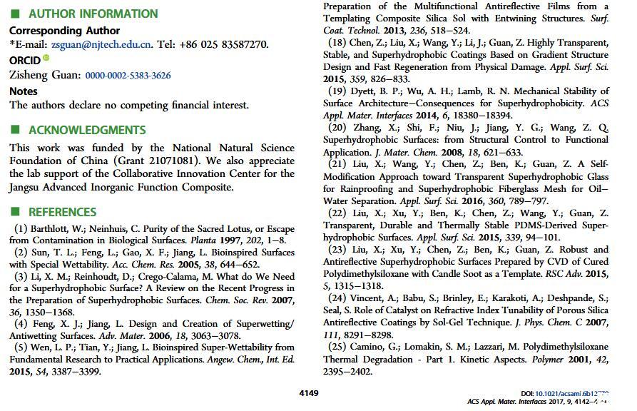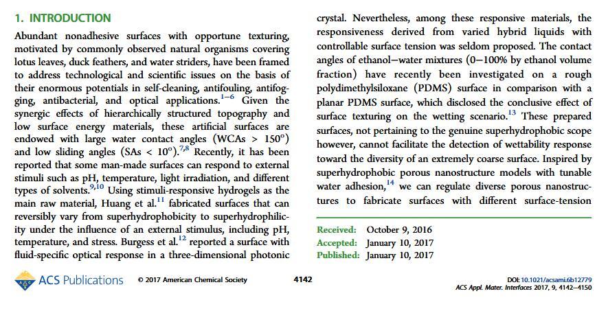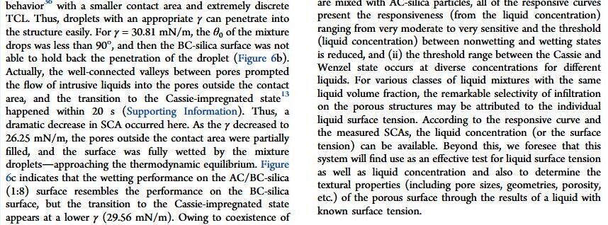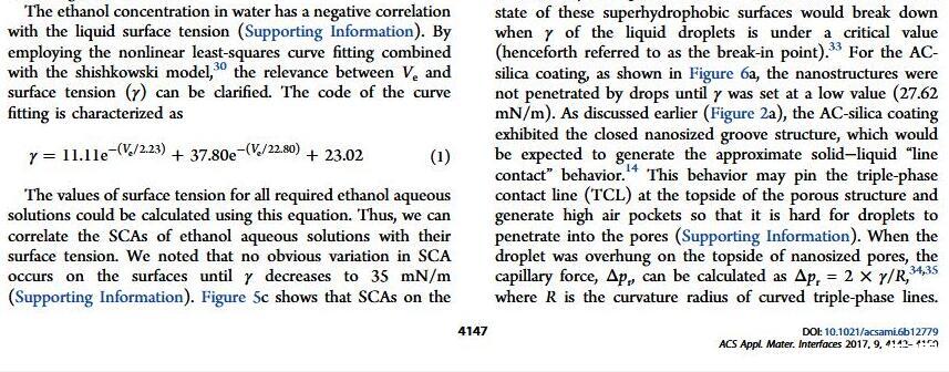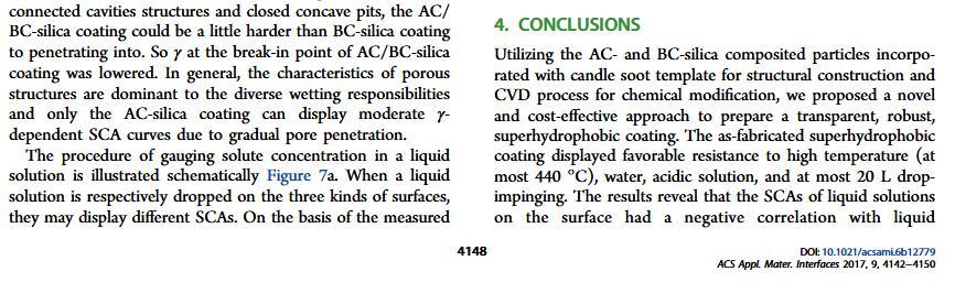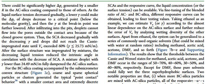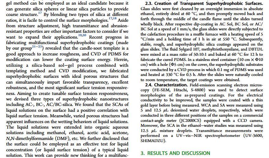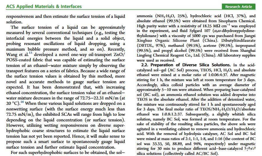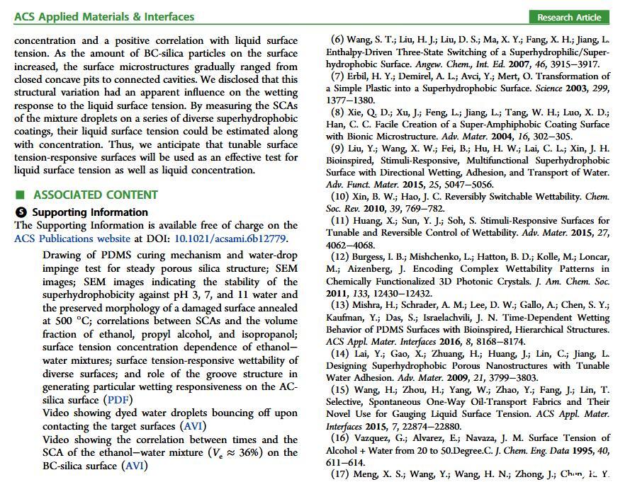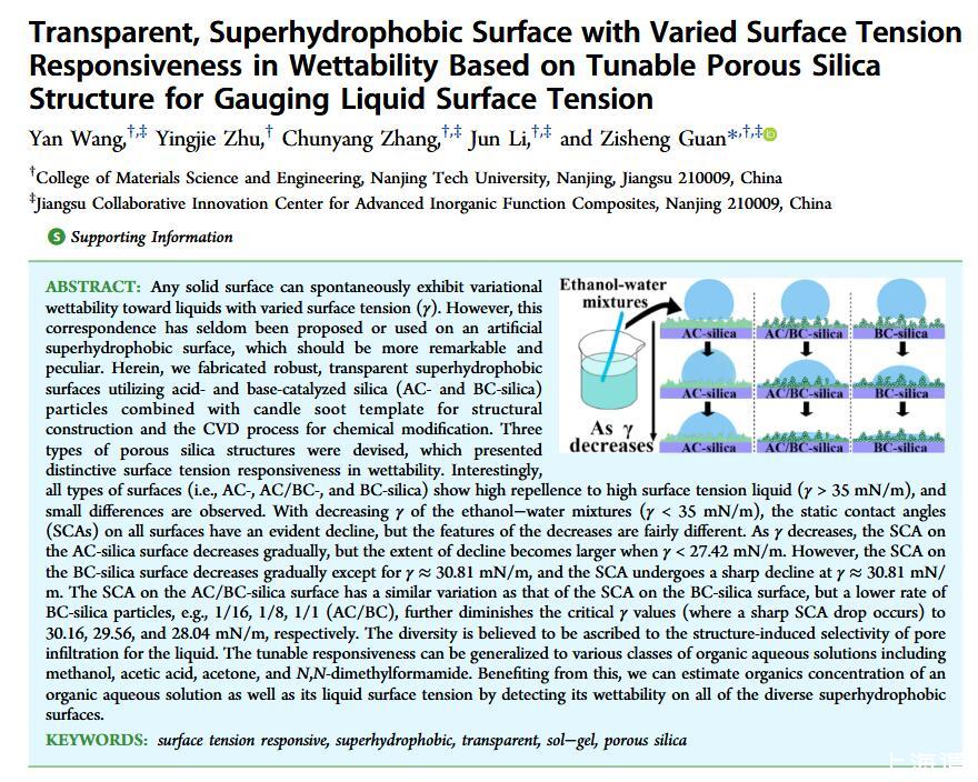 當液體的表面張力發(fā)生變化時,它在普通固體表面的潤濕性也會隨著變化。然而,關(guān)于這一規(guī)律以及尤其是在超疏水表面的表現(xiàn)的研究很少。最近,協(xié)同創(chuàng)新中心PI-6管自生老師課題組研究生王研等人利用上述的表面張力和潤濕性的響應(yīng)關(guān)系首次將透明超疏水涂層應(yīng)用在探測液體表面張力方面,為拓寬多功能超疏水涂層的應(yīng)用提供了一個新的思路,相關(guān)論文已被ACS applied materials&interfaces發(fā)表。研究表明,隨著有機物水溶液中有機物體積分數(shù)上升,溶液的表面張力相應(yīng)地下降,溶液液滴在制備的超疏水涂層的接觸角也逐漸下降,此稱之為表面潤濕性對表面張力的響應(yīng)。基于此響應(yīng)關(guān)系,可以通過接觸角估測液體的表面張力以及有機物的濃度。