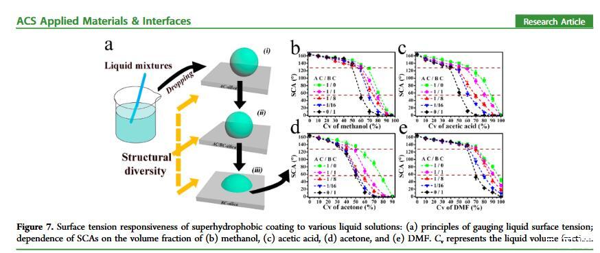 結(jié)果表明,以正硅酸四乙酯為前驅(qū)體通過酸性和堿性水解法制備了不同形貌的納米二氧化硅溶膠,通過混合兩種溶膠可制備出具有顆粒間鍵橋強度高的亞微米級凸起和納米級凹坑的結(jié)構(gòu)的涂層。通過控制酸堿催化溶膠混合比例,我們可以制備出具有不同微觀結(jié)構(gòu)的超疏水涂層。結(jié)果表明具有不同結(jié)構(gòu)的涂層具有不同的潤濕性-表面張力關(guān)系,隨著涂層制備時堿催化溶膠的比重增加,納米級凹坑結(jié)構(gòu)逐漸減少,表面更容易被低表面張力液體侵入,因而接觸角下降更劇烈。并且在有機物水溶液,包括:甲醇、乙醇、正丙醇、異丙醇、乙酸、丙酮、N,N’-二甲基酰胺等,都具有同樣的接觸角和濃度(表面張力)響應(yīng)規(guī)律。