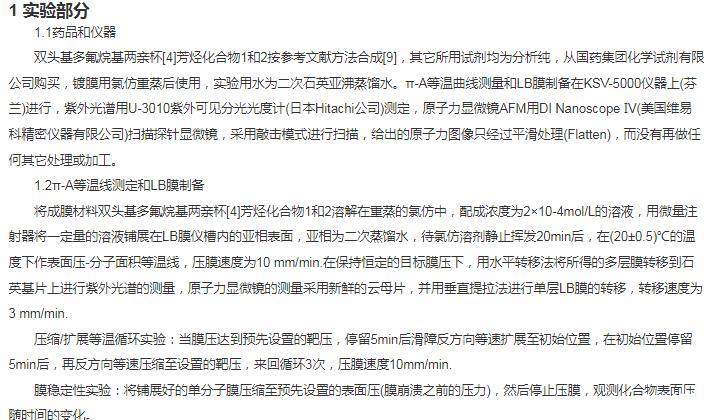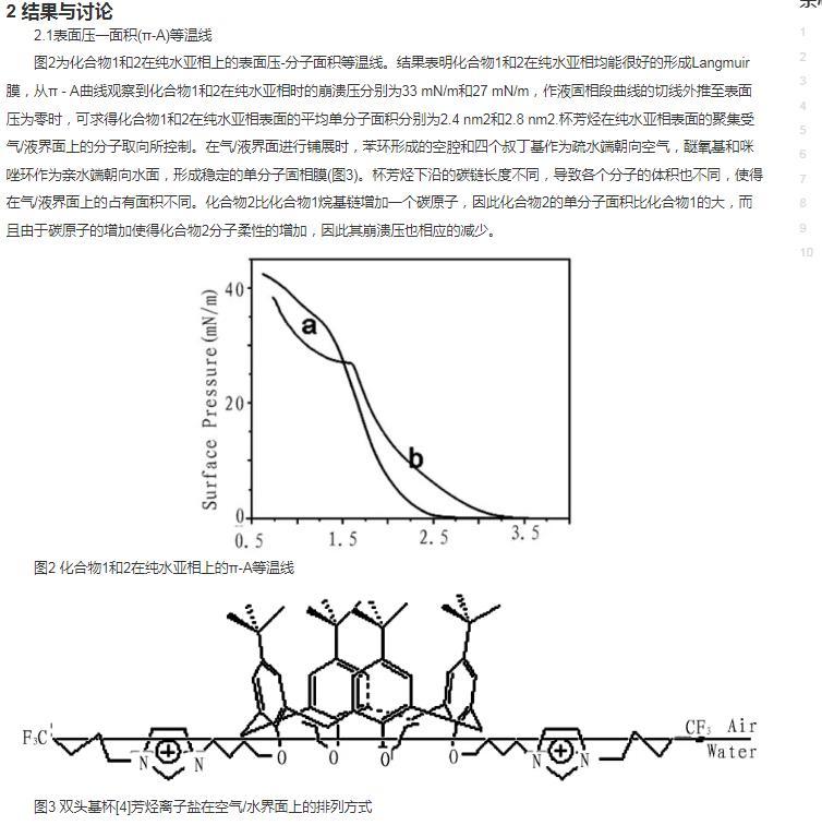 Langmuir-Blodgett膜技術(shù)(LB膜)是一種精確控制薄膜厚度和分子排列的單分子膜沉積技術(shù),即在水氣界面上能將成膜材料分子加以緊密有序地排列,形成單分子層,然后再轉(zhuǎn)移到固體襯底上的制膜技術(shù),利用該技術(shù)可以將功能化合物的光學(xué)、電磁學(xué)、分子識別與催化等性質(zhì)轉(zhuǎn)移到膜材料中。杯芳烴是繼環(huán)糊精、冠醚之后出現(xiàn)的第三代超分子主體分子,它具有空腔可調(diào)節(jié),構(gòu)象可變換,并易于化學(xué)改性和修飾等特點,特別是對它進(jìn)行適當(dāng)修飾以后的化合物在材料化學(xué),配位化學(xué),生物化學(xué)等領(lǐng)域表現(xiàn)出潛在的應(yīng)用前景與研究價值。基于上述認(rèn)識最近我們合成了雙頭基多氟烷基兩親杯芳烴化合物1和2(圖1),并對該化合物在空氣/水相界面的成膜性能以及LB膜的結(jié)構(gòu)進(jìn)行了研究。