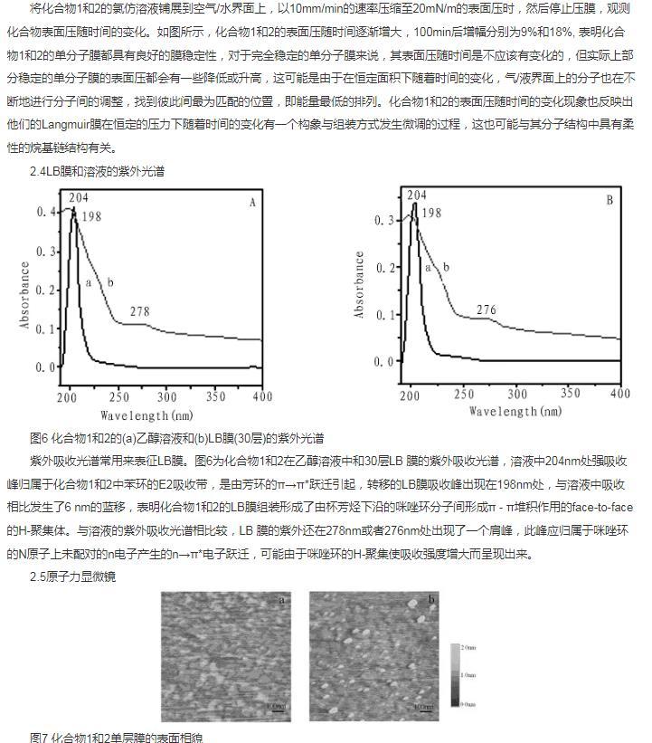 摘要:合成了雙頭基多氟烷基兩親杯芳烴化合物1和2,利用表面壓一面積(π-A)等溫線、壓縮/擴(kuò)張循環(huán)等溫線與膜穩(wěn)曲線研究了他們在空氣/水相界面的成膜性能,并用紫外光譜和原子力顯微鏡對組裝的LB膜進(jìn)行了結(jié)構(gòu)表征。結(jié)果表明:化合物1和2在空氣/水相表面均能很好的形成穩(wěn)定的Langmuir膜,取代基碳原子數(shù)的增加使得化合物2的Langmuir膜單分子面積增加,崩潰壓相應(yīng)減少,組裝的LB膜均為H-聚集體,結(jié)構(gòu)均勻,穩(wěn)定性好。