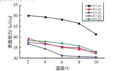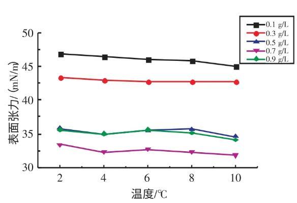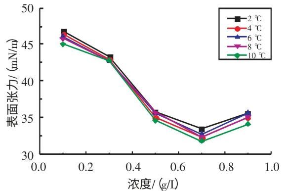 2.2.1不同溫度下十二烷基苯磺酸鈉溶液表面張力與濃度的關(guān)系實驗研究了在溫度為2、4、6、8、10℃條件下,SDBS溶液的表面張力與濃度的關(guān)系(見圖3)。由圖3可知,當(dāng)濃度在0.1~0.7 g/L時,隨著SDBS溶液濃度的升高,其表面張力逐漸減??;當(dāng)濃度在0.7~0.9 g/L時,隨著SDBS溶液濃度的升高,其表面張力逐漸增大。當(dāng)SDBS溶液濃度為0.7 g/L時,其表面張力取得最小值。