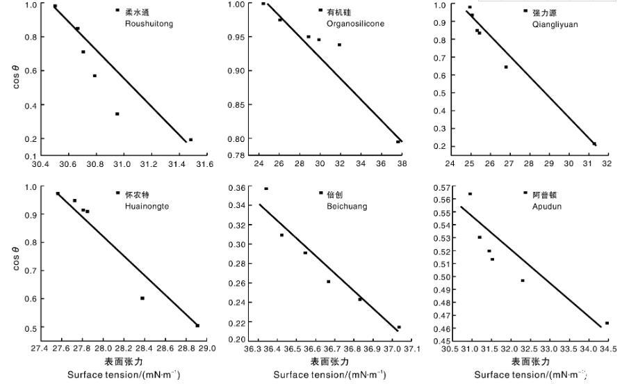 吡蟲(chóng)啉藥液、 阿維菌素、苦參堿表面張力與接觸角的關(guān)系
