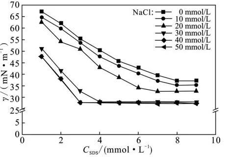 三種無(wú)機(jī)鹽的加入可以降低表面張力;當(dāng)NaCl、CuCl2,F(xiàn)e(NO3)3的濃度在40,1.25,1.25 mmol/L以下范圍內(nèi),在一定量SDS表面活性劑溶液濃度下,隨著無(wú)機(jī)鹽濃度的增加,表面張力逐漸減小;當(dāng)超過無(wú)機(jī)鹽添加濃度上限后,在一定量的SDS表面活性劑溶液濃度下,隨著無(wú)機(jī)鹽濃度的增加,表面張力將達(dá)到穩(wěn)定。同時(shí),無(wú)機(jī)鹽濃度的增加可以降低表面張力達(dá)到最低時(shí)所對(duì)應(yīng)的SDS表面活性劑溶液濃度值(Ct),各體系下的Ct即為cmc值,當(dāng)三種無(wú)機(jī)鹽添加濃度達(dá)到上限值后,表面張力達(dá)到最小值時(shí)所對(duì)應(yīng)的SDS表面活性劑溶液濃度都是3 mmol/L,加入Fe(NO3)3、CuCl2和NaCl之后,溶液的表面張力由37.29 mN/m分別降至21.35,23.44,27.53 mN/m。
