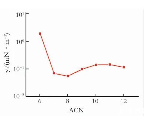 從圖2與表1可以看出,同樣條件下,甜菜堿與正構(gòu)烷烴間的界面張力遠(yuǎn)低于原油,說明油相性質(zhì)對(duì)油水界面張力有關(guān)鍵的影響,可能是原油中降低界面張力能力不如甜菜堿的活性組分分子在界面上的存在造成原油界面張力較高。
