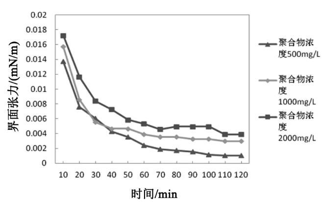 在石油磺酸鹽濃度為0.1%,模擬污水礦化度4200 mg/L,碳酸鈉濃度0.6%條件下,分別測(cè)定聚丙烯酰胺濃度為500、1000和2000 mg/L的復(fù)合體系隨時(shí)間變化的界面張力值,結(jié)果如圖2所示。