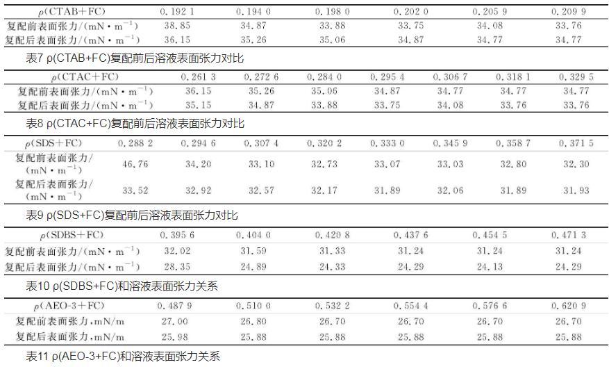 為了更好地提高表面活性劑的性能,降低表面活性劑的應(yīng)用成本,減輕其對環(huán)境的危害。在室溫下,分別測試不同濃度的碳?xì)浔砻婊钚詣┡cFC復(fù)配后表面張力的變化,實驗結(jié)果見表7~11。