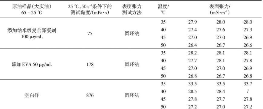 從表1可以看出,處理后添加納米級(jí)復(fù)合降凝劑100μg/mL大慶油樣、添加傳統(tǒng)EVA降凝劑50μg/mL大慶油樣、大慶空白油樣在25℃、50 s-1測(cè)試條件下的黏度是依次升高的,添加納米級(jí)復(fù)合降凝劑100μg/mL的大慶油樣品黏度最低,為75 mPa·s。相同的測(cè)試溫度條件下,黏度越大的油樣表面張力越大。其中,空白油表面張力最大,添加傳統(tǒng)EVA降凝劑的油樣次之,添加納米級(jí)復(fù)合降凝劑的油樣最小。原油油品的表面張力隨著溫度的降低而增大。