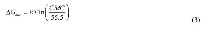 其中 R 是氣體常數(shù),NA 是阿伏伽德羅數(shù),T 是絕對(duì)溫度,并且 n 是溶質(zhì)種類(lèi)的數(shù)量,我們可以將其設(shè)置為 1。 膠束化的自由能 (ΔGmic) 由等式 (3) 計(jì)算。