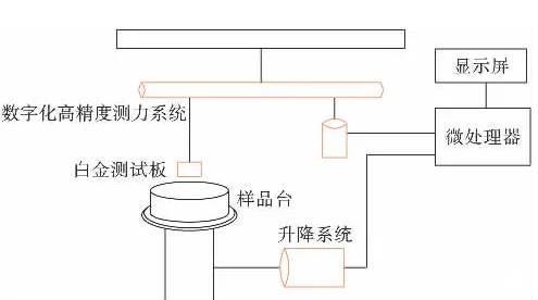 圖1為表面張力儀工作系統(tǒng)示意圖。硬件方面主要包括樣品臺(tái)、升降系統(tǒng)、數(shù)字化測(cè)力系統(tǒng)和微處理器。軟件方面由控制、分析專用軟件經(jīng)過微處理器的一系列運(yùn)算,將檢測(cè)到的微力轉(zhuǎn)化成表面張力值。由LCD數(shù)字顯示屏實(shí)時(shí)輸出表面張力值,如果需要,可通過RS232接口連接打印機(jī),打印數(shù)據(jù)或經(jīng)計(jì)算機(jī)采集相應(yīng)數(shù)據(jù)。該裝置結(jié)構(gòu)簡(jiǎn)單,操作簡(jiǎn)便,準(zhǔn)確性高。