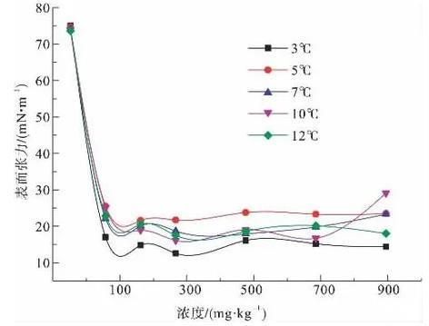 圖2為3、5、7、10、12℃下,陰離子表面活性劑CTAB溶液的表面張力隨濃度變化示意圖。由圖2可知,CTAB是比較優(yōu)良的表面活性劑,在低濃度下就能夠顯著降低溶液表面張力,在300 mg/kg-1時(shí)表面張力達(dá)到最低值,之后隨濃度增大,表面張力變化不大,因此CTAB的臨界膠束濃度CMC即在此濃度范圍附近。在所測(cè)溫度范圍內(nèi),當(dāng)CTAB溶液達(dá)到CMC以后,表面張力值在14.5~23.5 mN/m之間。隨溫度變化,表面張力值相差較大。