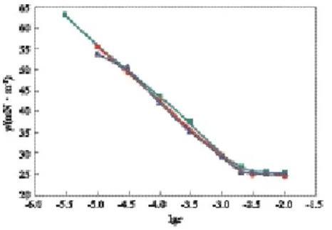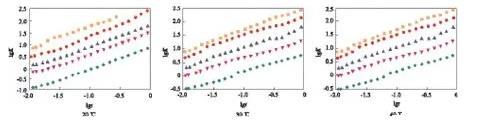 在lgc=-3.00時(shí),可看出較完整的動(dòng)態(tài)表面張力降低曲線,開(kāi)始時(shí)表面張力接近溶劑的表面張力,隨時(shí)間的延長(zhǎng)表面張力先快速下降,降至一定數(shù)值后,降幅趨緩,在一段時(shí)間內(nèi)基本保持不變。因?yàn)闅?液界面新生成時(shí),GSS362尚未在表面吸附,界面張力為溶劑的表面張力,隨著時(shí)間的延長(zhǎng),表面活性劑分子開(kāi)始在表面吸附,氣/液界面張力降低,隨著吸附的進(jìn)行,表面逐步趨于飽和,表面活性劑分子在表面吸附的速率下降,因而動(dòng)態(tài)表面張力下降速率變慢,趨于平衡。