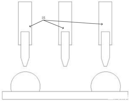 步驟S3:通過(guò)印刷機(jī)構(gòu)將摻入碳粉并通入正電荷的UV油墨鋪滿在紙張上,由于紙張上已覆蓋有固化的UV涂層,因此UV油墨在紙張上仍可自由移動(dòng),此時(shí)通過(guò)計(jì)算機(jī)處理印刷圖案,進(jìn)而控制印刷機(jī)構(gòu)向指定金屬探針輸送負(fù)電荷,其余金屬探針輸送正電荷,當(dāng)金屬探針接觸帶正電荷UV油墨時(shí),通過(guò)異電荷相互吸附的原理,UV油墨將向金屬探針聚攏;其余探針通過(guò)同電荷相互排斥的原理,UV油墨將向金屬探針?lè)捶较蛱右?,待金屬探針收回,UV油墨將因表面張力短時(shí)間內(nèi)無(wú)法流平,再對(duì)紙張表層所有UV油墨進(jìn)行最終固化;