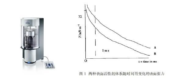 圖1顯示兩個不同表面活性劑體系A(chǔ)和B在不同吸附速度下,隨時間t而變化的表面張力γ,也可以叫作動態(tài)表面張力。這些曲線可以通過使用KRüSS最大氣泡壓力法來測量。氣泡在表面活性劑溶液中以不同的頻率形成,控制氣泡形成的時間并且測量氣泡中所產(chǎn)生的最大壓強,可以得到不同時間下的表面張力。在短時間內(nèi),觀察到表面活性劑體系B比A的體系所帶來的表面張力更小。