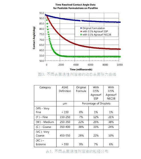 在實際生產(chǎn)中,噴頭尺寸、噴霧壓力也是改變噴量、霧滴粒徑的重要手段之一。本文僅討論了動態(tài)表面張力的改變對噴霧粒徑的影響,期望能為配方設(shè)計工作者提供合適的思路。