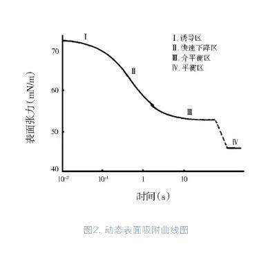 許多體系的動態(tài)表面張力和時間對數(shù)的曲線可分為4個階段:誘導(dǎo)區(qū)、表面張力快速下降區(qū)、介平衡區(qū)和平衡區(qū)。在誘導(dǎo)區(qū),由于吸附在界面層上的助劑質(zhì)量濃度太低,溶液的表面張力較大;隨著助劑大量被吸附到溶液表面,表面張力急劇降低,就形成了快速下降區(qū);而隨著溶液表面助劑分子的積累,吸附接近飽和時吸附速度變慢,就形成了介平衡區(qū);足夠長的時間后當(dāng)表面吸附達到飽和體系進入動態(tài)平衡階段表面張力達到平衡,此即為平衡表面張力。表面活性劑種類和質(zhì)量濃度不同,其溶液體系達到上述各階段所需時間不同,表現(xiàn)為各溶液體系間動態(tài)表面活性的差異。